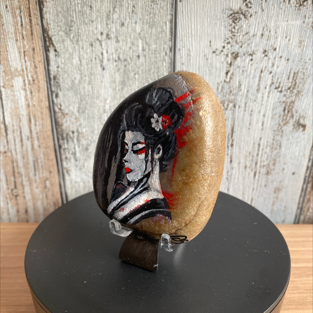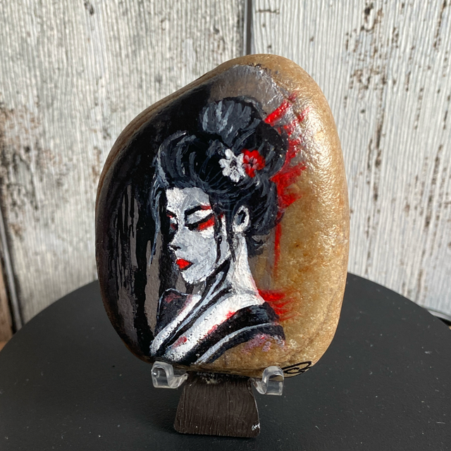 Cette jeune japonaise en kimono songe sur un fond noir/gris/ rouge
